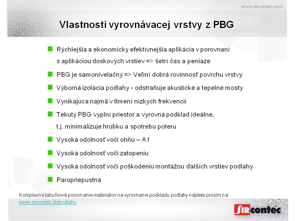 - najlepšie hodnoty útlmu krokového hluku, tiež v oblasti frekvencií 100 – 315 Hz, vykazuje podlaha s vyrovnávacou vrstvou z penobetónu SIRCONTEC PBG a to v kombinácii s akoukoľvek akustickou izoláciou