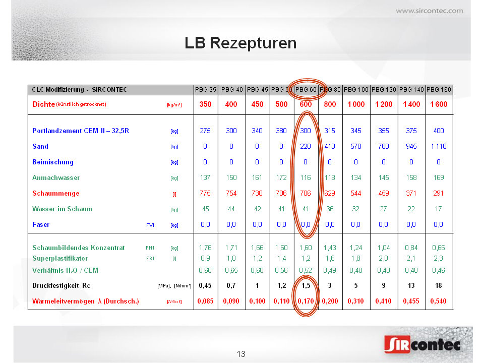 Schaumbetone SIRCONTEC PBG, technische Daten:
