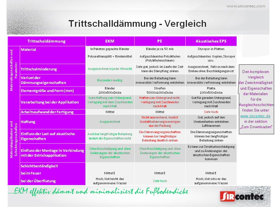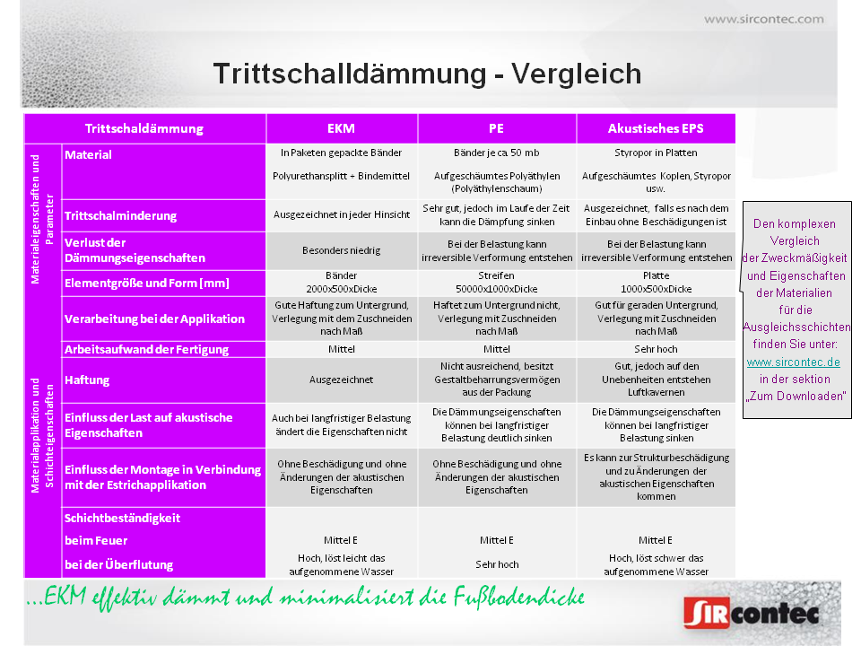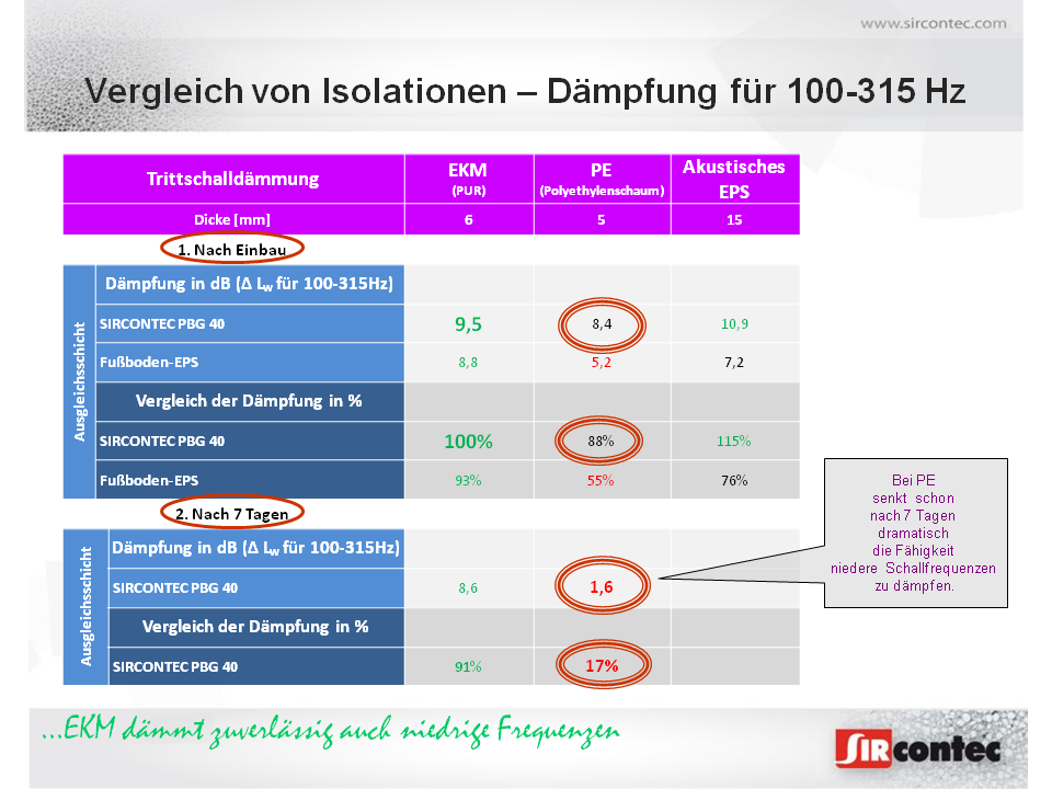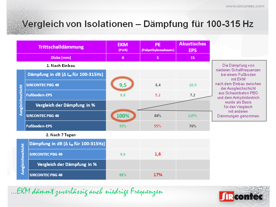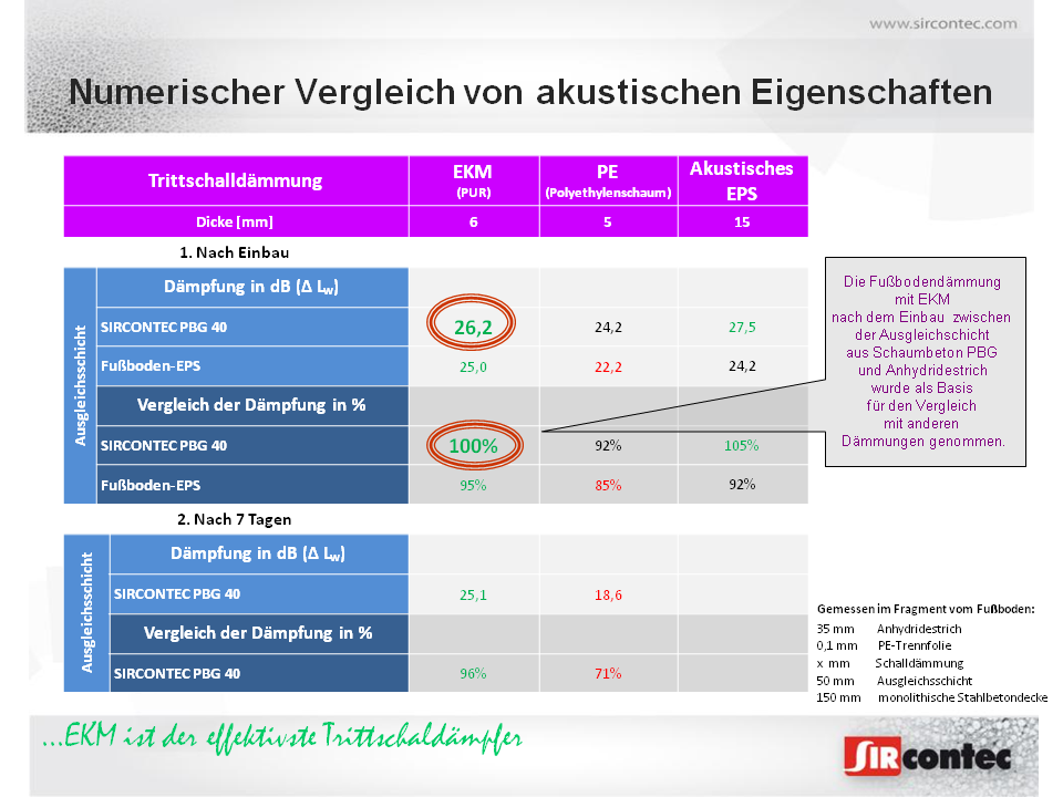 Die Gesellschaft SIRCONTEC hat die Vergleichsmessung der neuen auf PUR-Basis akustischen Isolation mit dem Handelsnamen EKM 1006 und EKM 1009&nbs ...